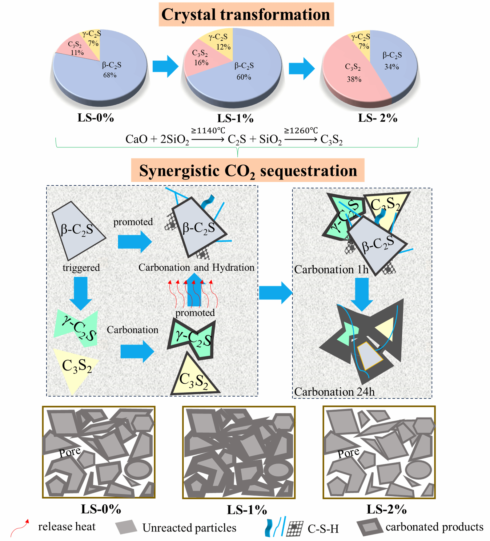 在新的研究成果中,王信剛教授團(tuán)隊(duì)提出以江西銅尾礦砂、江西鋰冶煉渣和電石渣為原料,在1260℃制備高性能低鈣CO?封存材料(LCCSM)。結(jié)果表明,鋰渣的摻入會(huì)顯著影響β-C2S、C3S2和γ-C2S的晶型比例,少量鋰渣的存在會(huì)顯著提高LCCSM的碳酸化活性,而過(guò)量鋰渣將會(huì)降低LCCSM的碳酸化活性,β-C2S、C3S2和γ-C2S三者之間具有協(xié)同固碳的作用。與每生產(chǎn)1噸普通硅酸鹽水泥排放約813千克CO?相比,每生產(chǎn)1噸LCCSM的CO?排放量?jī)H為約23千克。研究成果可為基于江西本土多元固體廢棄物制備高性能低鈣CO?封存材料以及硅酸鈣熟料多相共存、晶型轉(zhuǎn)變及其協(xié)同固碳封存機(jī)制研究提供理論指導(dǎo)。