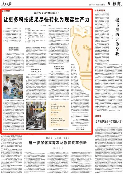 編者按:11月3日,人民日報紙質(zhì)版第5版教育以《讓更多科技成果盡快轉(zhuǎn)化為現(xiàn)實生產(chǎn)力(深聚焦)》為題,報道南昌大學(xué)食品科學(xué)與資源挖掘全國重點實驗室常務(wù)副主任熊濤等專家學(xué)者、企業(yè)代表結(jié)合實際共同探討如何助力更多科技成果盡快轉(zhuǎn)化為現(xiàn)實生產(chǎn)力。