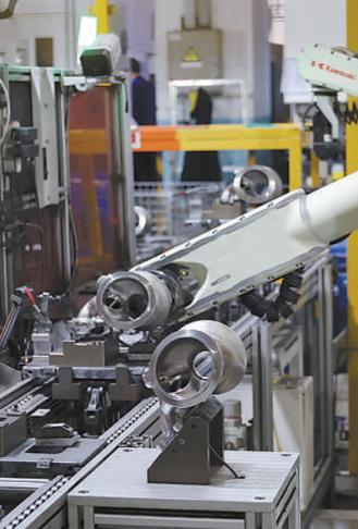 江蘇無錫職業(yè)技術(shù)學(xué)院教師團(tuán)隊為蠡湖增壓技術(shù)公司研發(fā)的殼體機(jī)器人自動化去毛刺工作站正在作業(yè)。