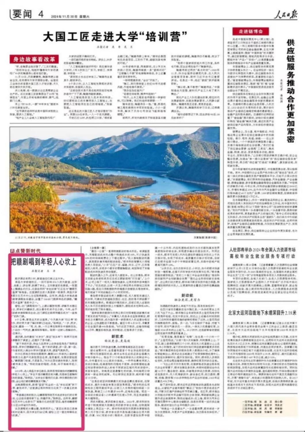 編者按:11月30日,人民日?qǐng)?bào)第四版要聞板塊以《把贛劇唱到年輕人心坎上》為題,報(bào)道我校贛劇文化藝術(shù)中心主任陳俐教授把課堂變成展示贛劇的舞臺(tái),用新方式將贛劇唱到年輕人心坎上,在師生互動(dòng)中助力大學(xué)生勞動(dòng)教育和非遺技藝傳承,進(jìn)一步展現(xiàn)了我校通識(shí)教育課程體系建設(shè)以及教學(xué)育人成果。詳情如下: