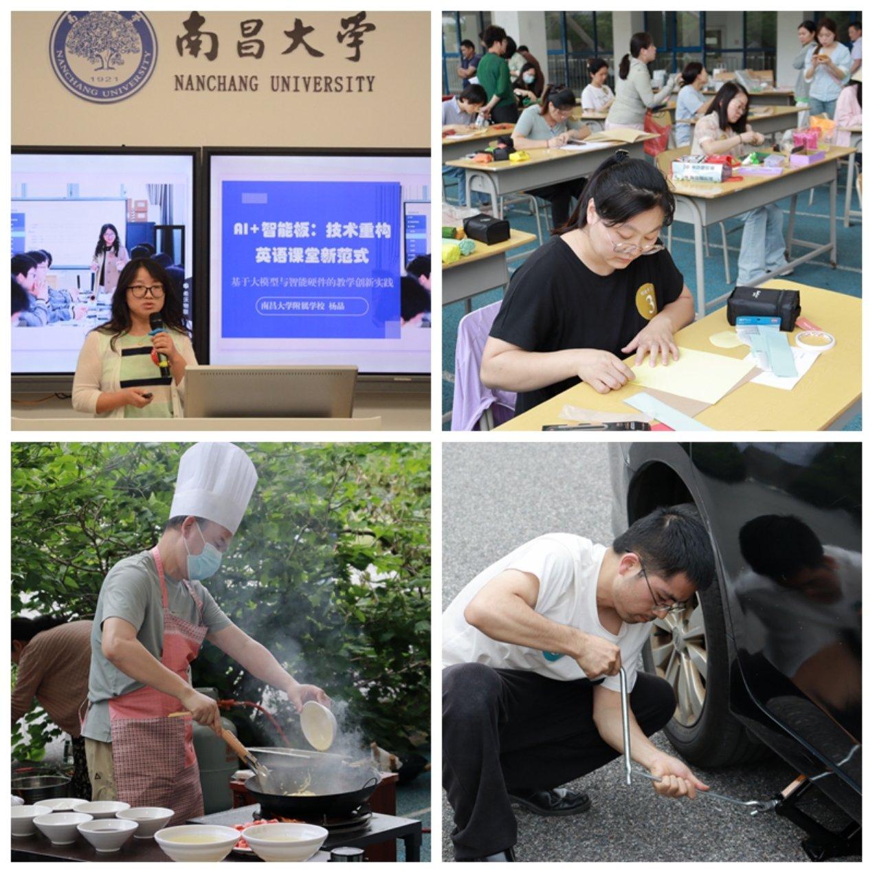 活動現場氣氛熱烈,亮點紛呈。在板書書寫區,老師們筆鋒遒勁、布局精巧,展現了“三尺講臺育桃李”的師者匠心;在實驗操作區,“點亮‘五一’”項目要求選手精準連接線路、制作燈牌,考驗專業技能與審美能力,戴手套插槍頭,比拼的是選手的速度與精準;急救技能考場內,單人心肺復蘇操作規范嚴謹,彰顯生命教育的溫度;運輸技能賽場熱火朝天,拆裝輪胎與倒車移庫環節盡顯教職工“硬核實力”;餐飲技能區香氣四溢,參賽選手以刀工如飛、火候精準的技藝奉獻味覺盛宴;創意手工區上的剪紙、手工作品栩栩如生,將傳統技藝與現代創意完美融合;AI+教育教學案例展示則凸顯了前沿科技與教育實踐的深度融合。